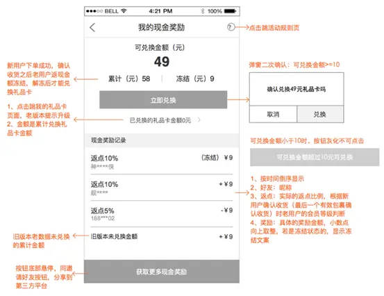 兑换页面即老用户的奖励金额与奖励记录页面。强调已获得的收益的同时,还要列出奖励记录。当前页面强调的是“兑换”,因此设计上凸显兑换按钮,同时带出邀请按钮。引导用户看到邀请成果之后再次发出邀请。但邀请不能喧宾夺主,因此弱化了邀请按钮。