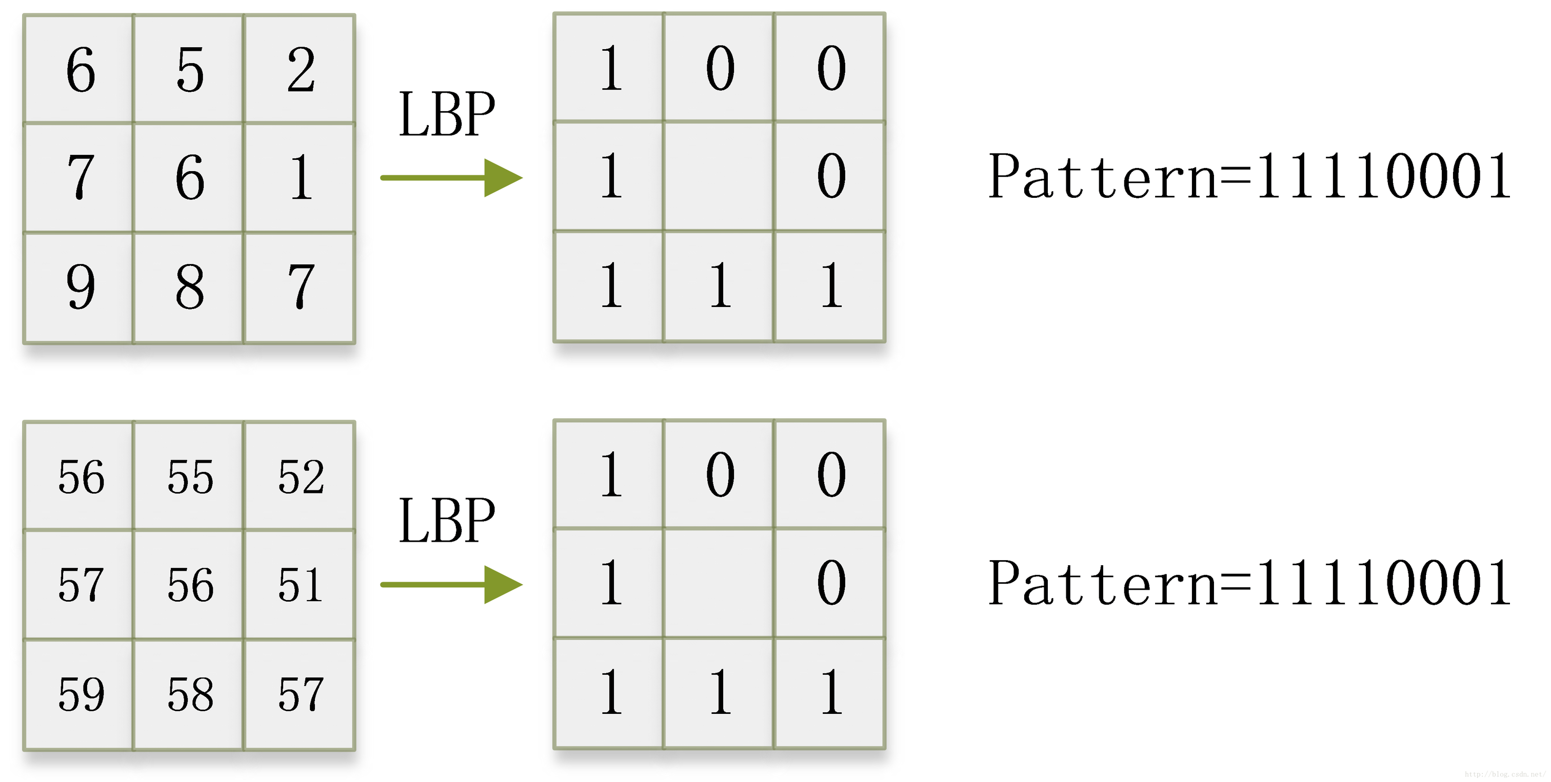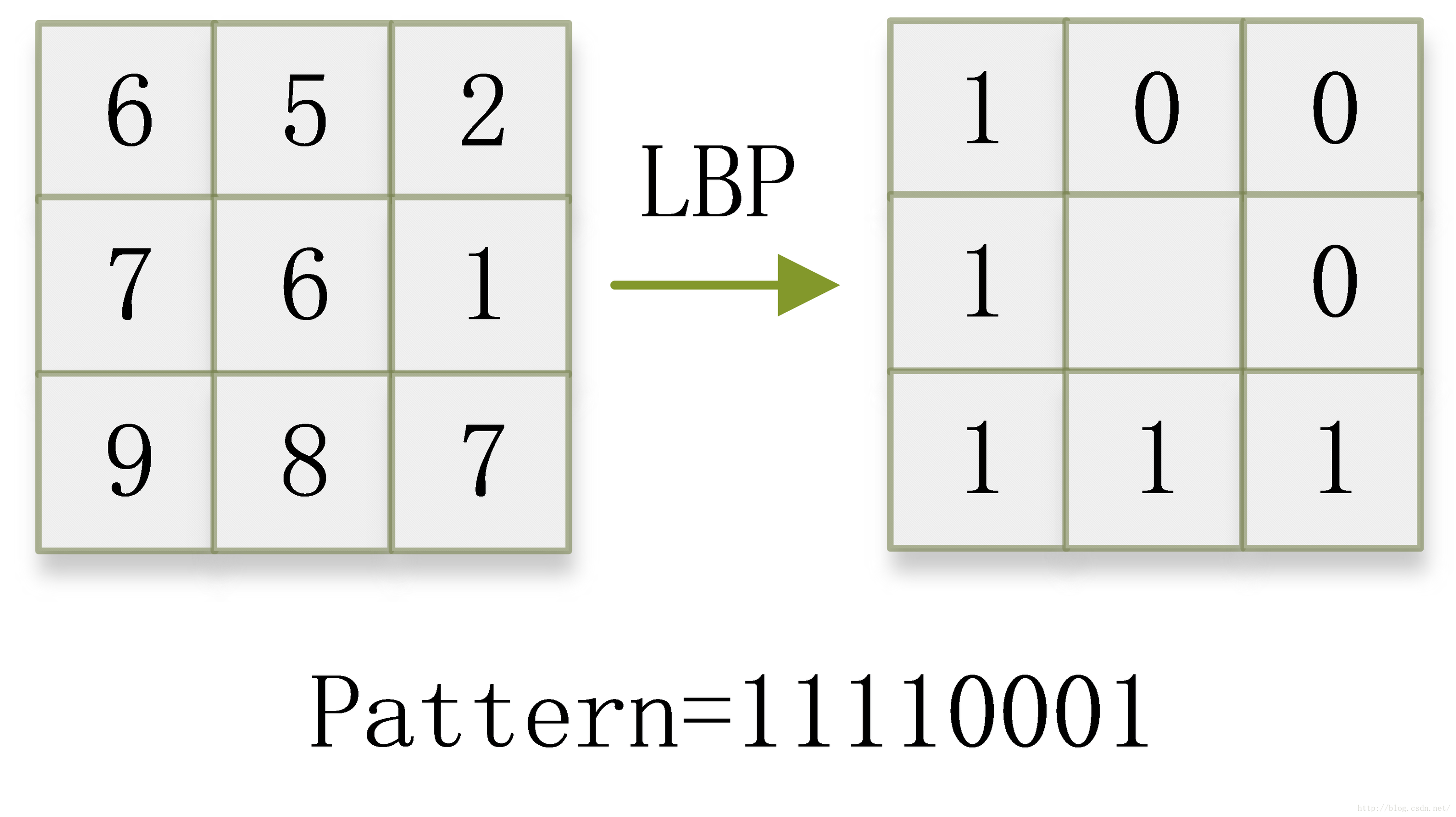LBP的基本思想是:原始的LBP算子是3*3的窗口,以中心像素为阈值,将相邻的8个像素的灰度值与中心像素进行比较,如果大于,则设为1,小于则为0,故而得到这9个像素的二值化图,故而名称为局部二值化,如下图所示。从二值化图的左边中心点像素为起点,逆时针方向为正方形,按顺序取该二值化数值,便得到图中Pattern的二进制数值,此数值就是一个LBP编码,此时,我们称该中心像素点的LBP值为11110001。如果对一幅图像中的所有像素点都计算LBP值,得到的就是这幅图的LBP特征图。
