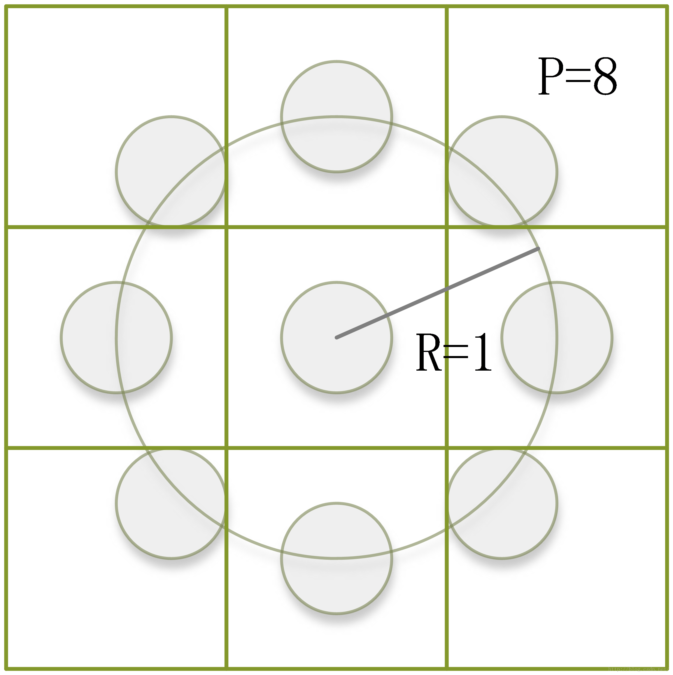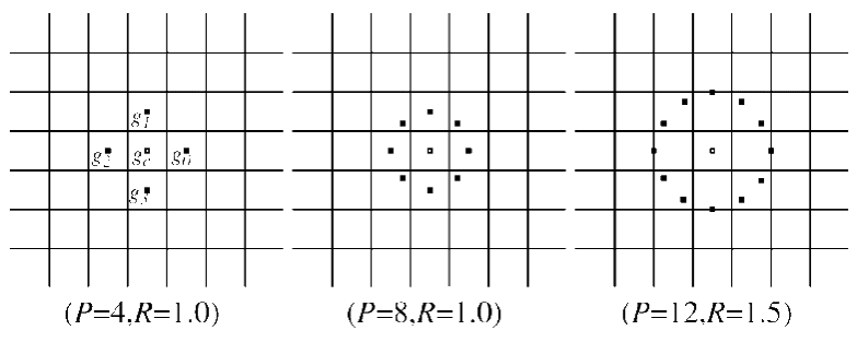 上面的LBP算子有一个缺陷,它只覆盖一个固定半径范围内的小区域,这显然不能满足不同尺寸和频率纹理的需要,故而有人对其进行改进,将3*3领域扩展到任意领域,并用圆形领域代替正方形领域,如下图为以中心像素点为圆心,R为半径,在圆上均匀的选取P个点作为采样点的情况。