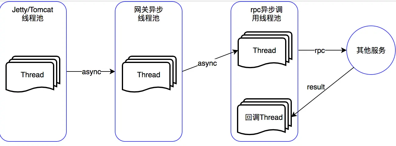 由在web容器中开启servlet异步,然后进入到网关的业务线程池中进行业务处理,然后进行rpc的异步调用并注册需要回调的业务,最后在回调线程池中进行回调处理。