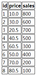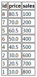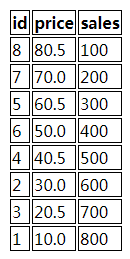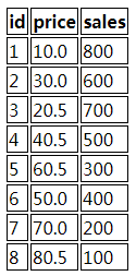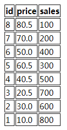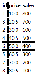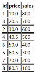 <tr><th>id</th><th>price</th><th>sales</th></tr>