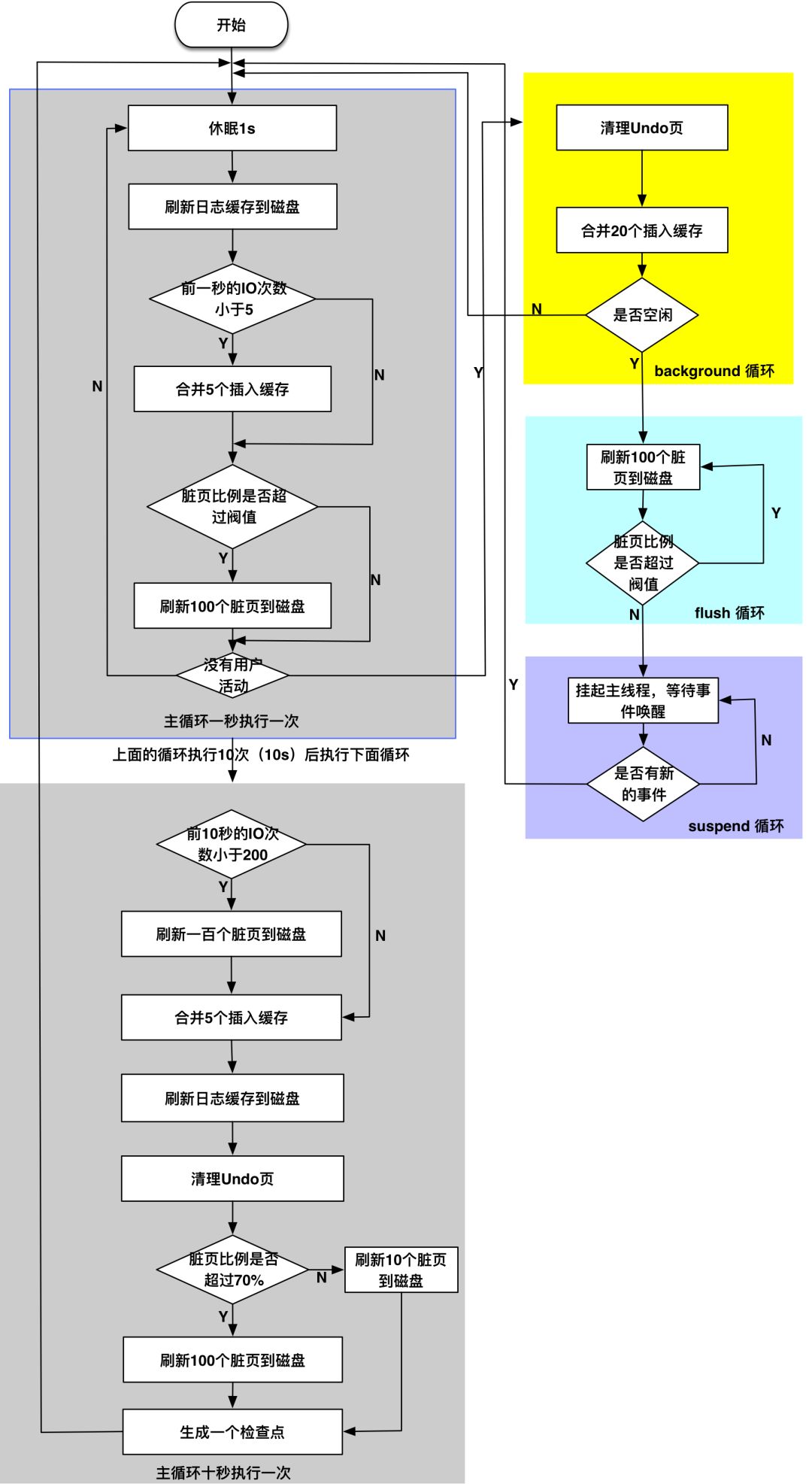 InnoDB 存储引擎的主要工作都在一个单独的 Master Thread 中完成,其内部由四个循环体构成:主循环( loop )、后台循环( background loop )、刷新循环( flush loop )、暂停循环( suspend loop )。具体工作流程如下图所示: