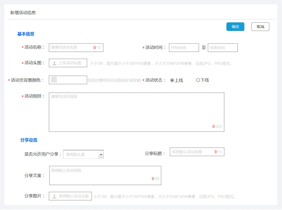 活动页需要上传的图片和设计者的设计强相关,若活动页是使用者百分百自定义,则需要开发一个自定义配置页面;若只有活动头图和活动规则部分自定义,则需要上传活动头图和活动规则图片(通常由UI设计好)。
