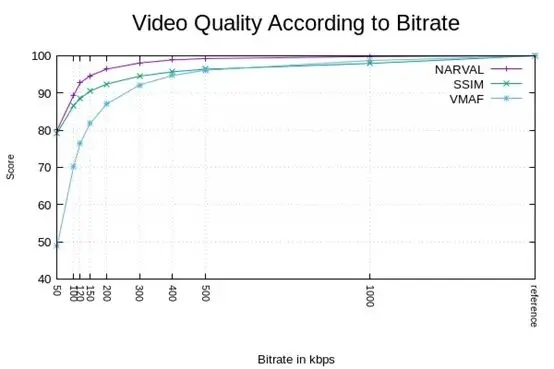 为了进行健全性检查,我们再次计算了NARVAL在相同参考视频上的SSIM和WMAF分数所提供的分数。我们可以看到,虽然不完全相同,但得分表现出相同的行为。有趣的是,它还说明了图像处理社区中已知的结果,但在WebRTC社区中显然是违反直觉的:感知视频质量不会随比特率/带宽线性降低。您可以在下图中看到,要将质量降低10%,您需要将带宽减少6到10倍!