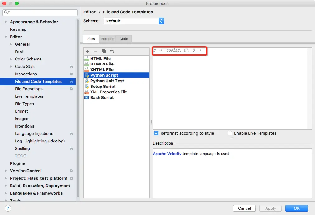 1.配置python文件模板,在创建pyton文件时可以默认加上# -*- coding: UTF-8 -*-,加上这个可以规避python文件中有中文字符时,部署应用到服务器上报错的问题。(不添加默认编码本地运行不会报错,python3以上已经支持了中文字符。)