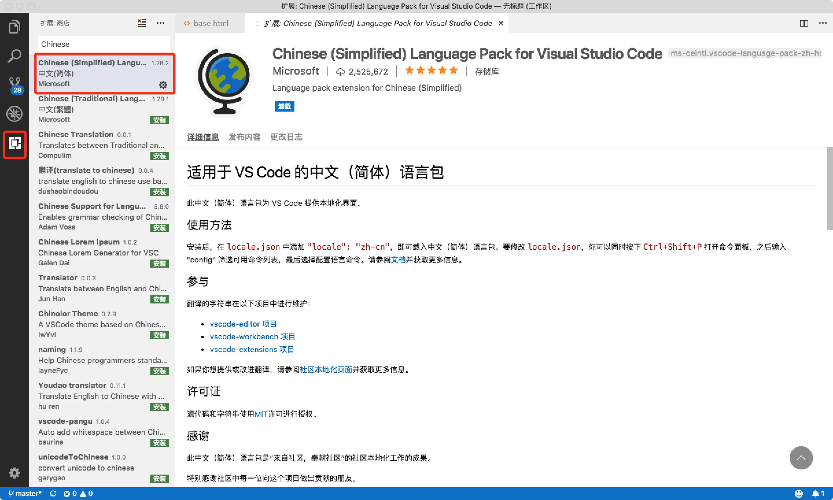 1.进入扩展界面搜索Chinese并安装中文语言包