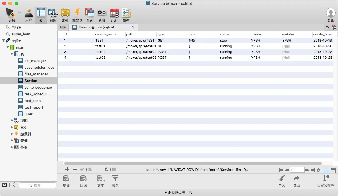 本项目使用的sqlite,使用Navicat可以很方便的操作数据库,可以直接打开DB文件操作,效果图如下:
