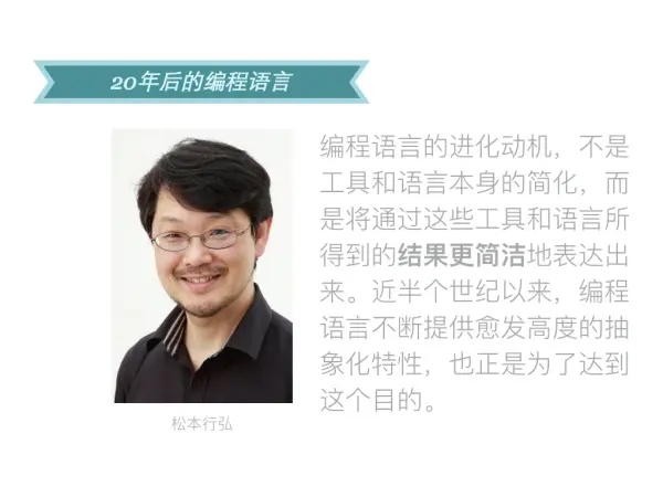 根据这条线的延伸,松本行弘的预判是:编程语言要解决的问题将从“如何做”变成“做什么”,即完成一个任务需要的指令会更加简洁。