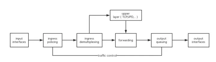 如上图所示,报文分组从输入接口(Input Interfaces)接收进来,经过流量限制(Ingress Policing)丢弃不符合规定的数据包,由输入多路分配器(Input deMultiplexing)进行判断选择,以确定是发给本机的,还是需要转发的。如果是发给本机的,就直接向上递交给上层的协议,比如TCP或UDP;如果是转发的,则将数据包发给转发块(Forwarding Block),转发块同时也接收本主机上层(TCP、UDP)产生的包,通过输出队列(Output Queue),从输出网卡发出。网络流量的控制通常发生在输出网卡处,虽然在路由器的入口处也可以进行流量控制,Linux也具有相关的功能,但一般说来,由于我们无法控制自己网络之外的设备,入口处的流量控制相对较难。因此我们这里处理的流量控制一般指出口处的流量控制。流量控制的一个基本概念是队列(Qdisc),每个网卡都与一个Qdisc相联系,每当内核需要将报文分组从网卡发送出去,都会首先将该报文分组添加到该网卡所配置的队列中,由该队列决定报文分组的发送顺序。因此可以说,所有的流量控制都发生在队列中。