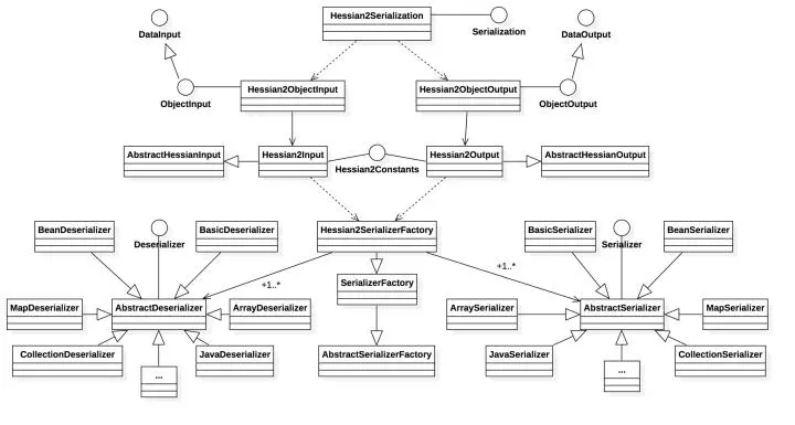 Hessian2Serialization: 这个类是外部调用序列化的入口,这个类实现了Serialization接口, serialize和deserialize是返回新建序列化处理对象,比如return new Hessian2ObjectOutput(out);,通过此种方式保证线程安全调用。