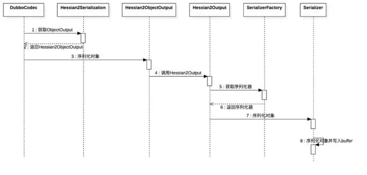 Hessian Lite序列化流程如上时序图所述,之前的类图上没有加入DubboCodec,是因为这个不是本文所要分享的内容,与dubbo的rpc通信相关;时序图中描述序列化对象,对象只是一个抽象的称呼,可以是Object、List、Map等等,DubboCodec是对ExchangeCodec的一个继承,并重写了部分方法,其中对于协议头的序列化实现在ExchangeCodec中完成的,DubboCodec中会序列化一些附加信息;
