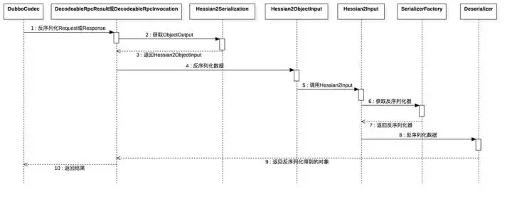 Hessian Lite反序列化流程如上时序图所述,DubboCodec需要区分是请求还是响应,对于请求利用DecodeableRpcInvocation来做处理,对于响应利用DecodeableRpcResult来做处理,其实序列化也是区分响应还是请求的,对于序列化DubboCodec是通过两个不同的函数实现的;