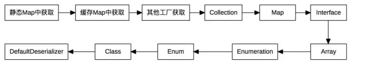 Class类型时为何不将之放入静态Map当中,是因为改反序列化器需要获取当前的类加载器,而且在流程中还少了一些类型,是因为在初始化静态Map时,将其及其子类已经放入了静态Map当中。