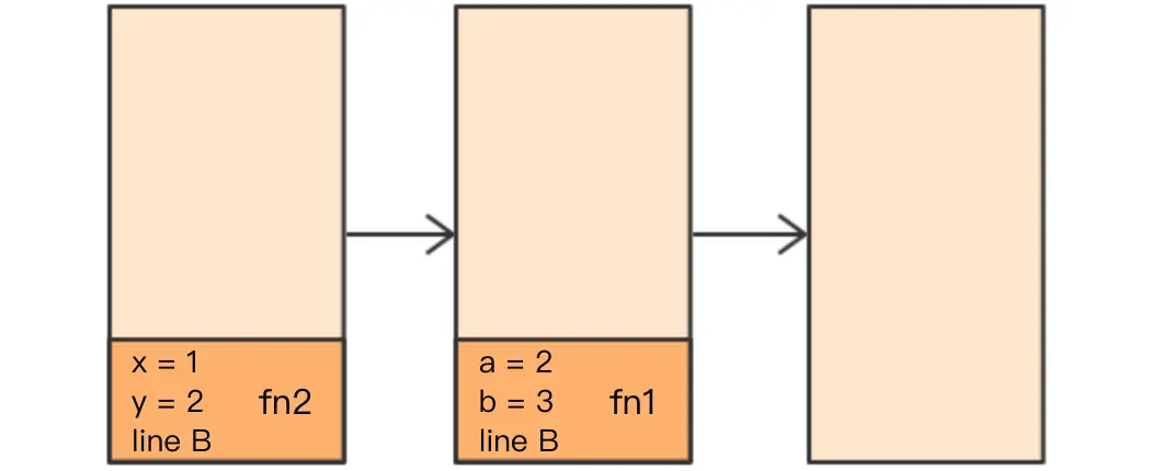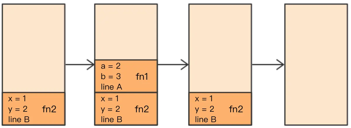 fn2被压入栈,x、y依次被创建并赋值,栈内也会记录相应的信息,同时也记录了该函数被调用的地方,这样在函数 return 后就能知道结果应该返回到哪里。然后fn1入栈,当它运行结束后就可以出栈,之后fn2也得到了想要的结果,返回结果后也出栈,此段代码运行结束。仔细看一下以上过程,你有没有觉得第二第三步中