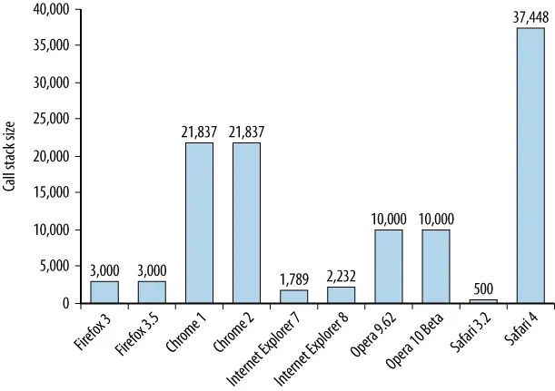 我们知道, js 引擎(包括大部分语言)对于函数调用栈的大小是有限制的,如下图(虽然都是很老的浏览器,但还是有参考价值):