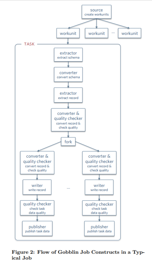 Gobblin的官方论文上给了一个Kafka数据抽取到HDFS的示例,通过Job运行在Yarn上,Gobblin可以达到运行一个long-running,流处理的模式。分为如下几步: