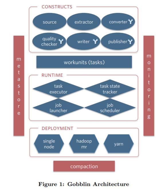 Job被创建后,Runtime就根据Job的部署方式进行执行。Runtime负责job/task的定时执行,状态管理,错误处理以及失败重试,监控和报告等工作。Gobblin存在分支的概念,从数据源获取的数据由不同的分支进行处理。每个分支都可以有自己的Converter,Quality Checker,Writer和Publisher。因此各个分支可以按不同的结构发布到不同的目标地址。单个分支任务失败不会影响其他分支。 同时每一次Job的执行都会将结果持久化到文件( SequenceFiles)中,以便下一次执行时可以读到上次执行的位置信息(例如offset),本次执行可以从上次offset开始执行本次Job。状态的存储会被定期清理,以免出现存储无限增长的情况。