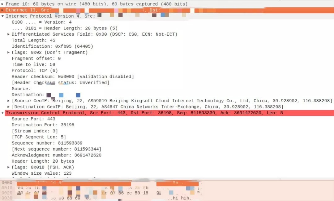 通过上面的分析,我们又产生了疑问:现在的硬件网卡一般都具有csum offload的功能,能够通过网卡硬件帮我们做checksum,难道是网卡的checksum offload功能出现了问题?如果真是网卡硬件的offload功能出现问题,那影响的应该不是某一个特定的数据包,而是所有经过这块网卡的数据包才对,因此我们怀疑是网卡在针对某个特定数据包的计算checksum的时候产生了错误,为了验证这个问题,我们在dpdk-lvs上进行抓包分析,以下是抓包截图: