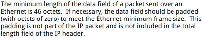 这个包就是被不断重传的包,能够看到dpdk-lvs确实收到了这个包,并且处理逻辑也完全正常,剩下的步骤只有通过网卡做checksum并把这个数据包转发出去,问题似乎确实是出在了计算checksum这里,我们在分析这个包有什么特点,可以看到,这个包的初始大小=ethernet header length + ip header length + tcp header length + tcp data = 14 + 20 + 20 + 5 = 59,而我们知道,在网络中传输的数据帧最小长度为64字节,除去FCS的4字节(这部分也由网卡自行计算后添加在数据包末尾),最小长度应为60字节,也就是说,到达网卡的数据包如果不够60字节,那么网卡会在动在数据包末尾增加全0的padding来使数据包能够达到60字节,所以这个数据包也是需要网卡硬件来补充1字节的padding来达到最小传输长度。对此rfc894是这样规定的: