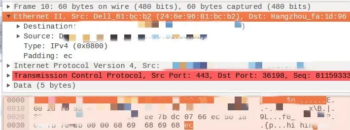 可以看到,在二层头中,确实有个补充的 1 字节的 padding:ec,这个 padding 并没有按rfc894的规定填充成全0,而是填了非 0 值,这样就造成了dpdk-lvs的网卡在计算 tcp checksum 时把这个 padding 误当成了 tcp data 而计算了check sum,因此在 client 接收到这个数据包并根据ip伪头部和tcp头部计算出来的 checksum 与数据包 tcp 头部的 checksum 不一致,因此并没有把这个数据包交给上层应用处理而是直接 drop。