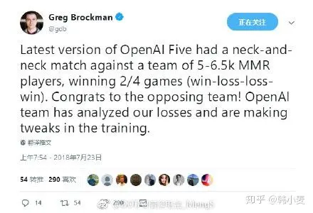 今日OpenAI的工作人员发推说,在近期OpenAI和5位6500分的选手进行了比赛,取得了2/4的成绩(赢-输-输-赢),在比赛后会继续对OpenAI做出调整。