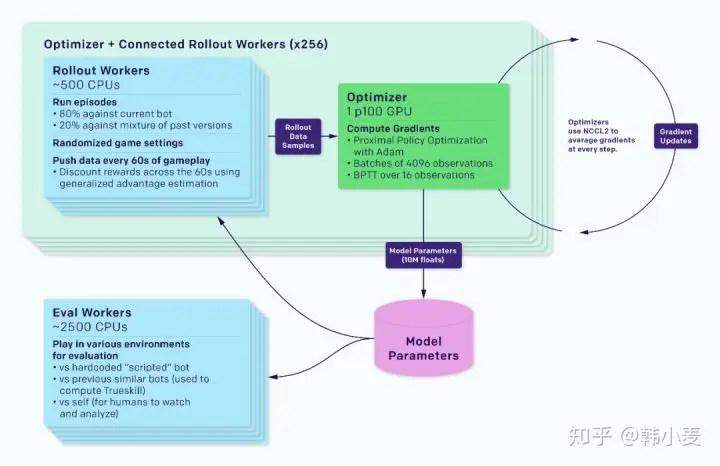 我们的系统是用通用的强化学习训练系统 Rapid 来实现的。Rapid 可以被应用到任何一个 Gym 环境。在 OpenAI,我们也用 Rapid 来解决其他问题,包括竞争性自我对抗训练(Competitive Self-Play)。