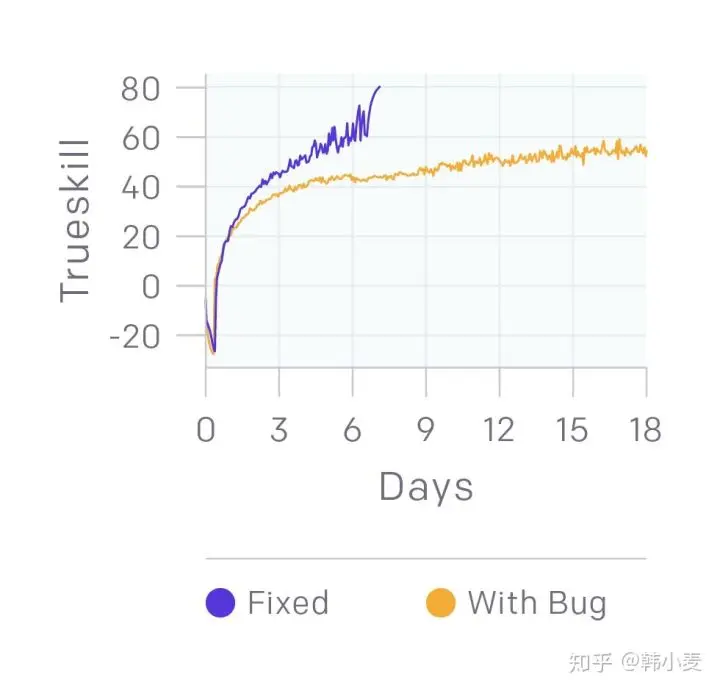 我们仍在修复系统漏洞。下图显示了击败业余玩家的训练代码,相比之下,我们只是修复了一些漏洞,比如训练期间的罕见崩溃,或者导致达到 25 级的巨大负面奖励的错误。事实证明我们可以在隐藏严重漏洞的情况下,依然击败优秀的人类玩家!