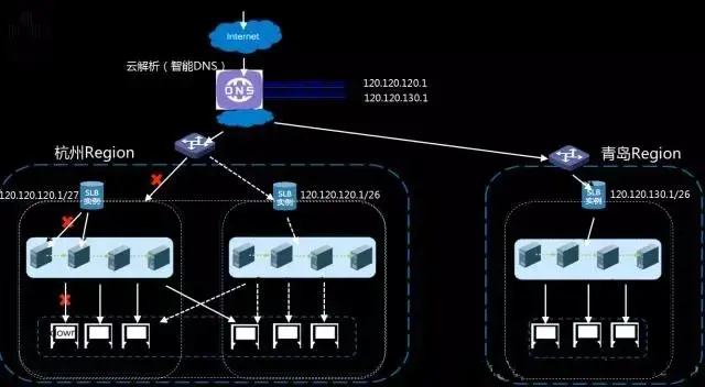 我们的高性能负载均衡使用LVS和Tengine,在一个region区分不同的机房,每个机房都有LVS集群和Tengine集群,对于用户配置的四层监听,LVS后面会直接挂载用户ECS,七层用户监听ECS则挂载在Tengine上,四层监听的流量直接由LVS转发到ECS,而7层监听的流量会经过LVS到Tenigine再到用户ECS。每一个region里都会有多个可用区,达到主备容灾目的,每一个集群里都有多台设备,第一是为了提升性能,第二也是基于容灾考虑。