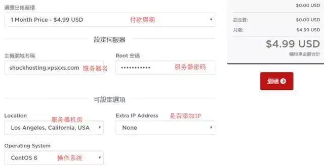 接下来选择配置,如图所示,可以选择付款周期是月付还是年付,服务器名随便写,服务器密码自己记好。服务器机房有三个机房可选,VPS小学生这里选择的是洛杉矶机房,是否添加IP这里一般不需要。然后选择自己习惯用的服务器操作系统,点击右侧的“继续”