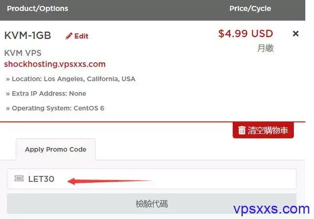 然后输入ShockHosting优惠码LET30,就会变成优惠后的价格,点击右侧的checkout