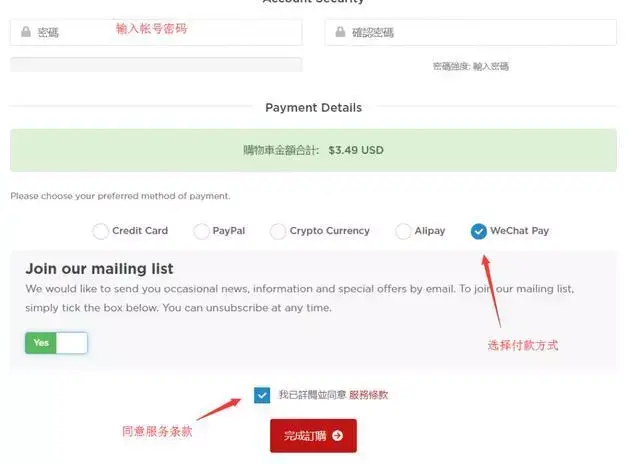 接着输入帐号密码并确认输入一次帐号密码。可以看到付款方式有paypal、支付宝和微信支付,VPS小学生建议首选paypal支付,因为这次活动的原因,这里选择WeChat Pay使用微信支付。同意服务条款后点击“完成订单”。接着用选择的付款方式付款就可以了。VPS小学生这里是用微信扫描二维码付款后点击retun to website返回网站,稍等几秒钟就提示订单完成并且有订单号了。