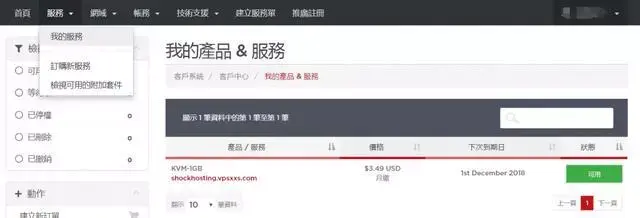 接下来在导航的“服务”“我的服务”这里就可以看到刚才购买的VPS了!这时候也会收到邮件,邮件里有服务器各种信息如服务器密码、端口,VNC管理平台信息等。