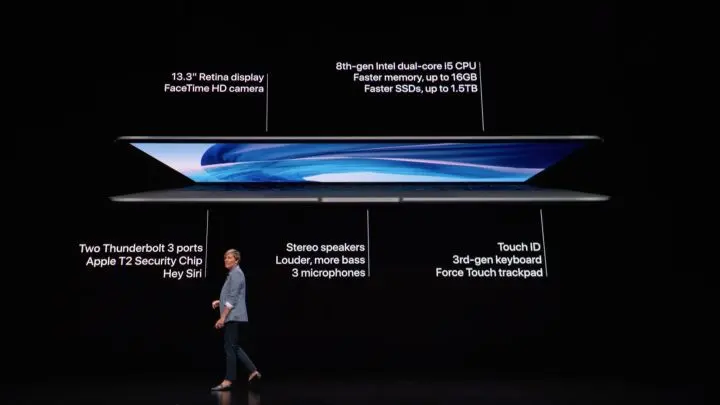 苹果这次终于发布了新的 MacBook Air,而且是在发布会上首个亮相的设备。第八代 Intel Core i5 处理器、13.3 英寸 Retina 显示屏、三代蝶式键盘,不仅如此,苹果还为 MacBook Air 加上了 Touch ID,可以说是一次从头到脚的大升级,从某种意义上来说,新的 MacBook Air 简直就是一台低价版的 MacBook Pro。