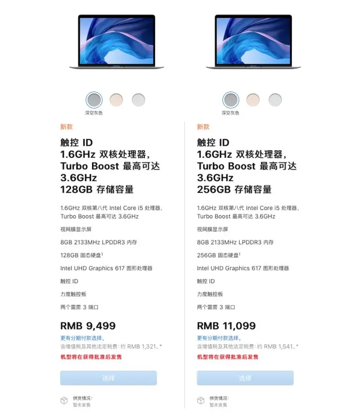 新款提供了深空灰、金色、银色三种颜色可选,目前 MacBook Air 已经其它国家和地区开始预售,并将于 11 月 7 日起发货。中国大陆官网虽已公布价格,但发售时间仍要等到获得批准后才能确定。