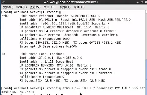 eth0,但是虚拟主机有非常多个,因此我们从这个设备中,分出子设备,那么,如何进行分? 看图最后两行(注意终端命令的变化):
