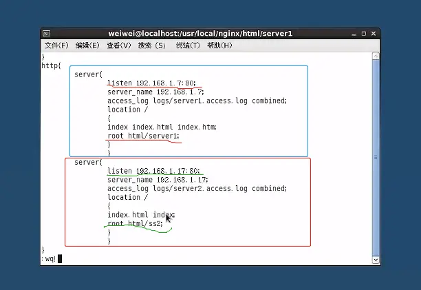 server1/index.html和ss2/index.html,才能被访问到。为了便于测试,我们分别在两个html文件中输入文本内容: