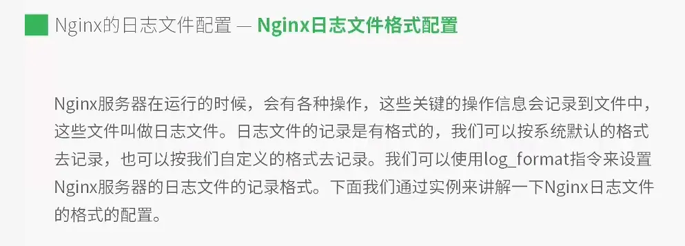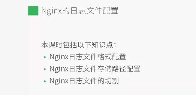 $remote_addr:客户端ip地址$remote_user:客户端用户名$request:请求的URL,用户请求的地址$status:请求状态(请求中、请求完毕)$body_bytes_sent:给用户返回数据的字节数$http_referer:源网页$http_user_agent:客户端浏览器的对应信息$http_x_forwarded_for:客户端的IP地址,与remote_addr相似- 若想自定义日志文件,可根据以上内容进行配置。