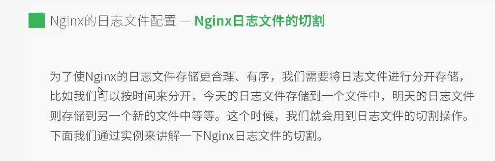我们之前的配置,可知道我们的日志文件放在access.log日志文件中. 我们现在进行切割,以前的日志记录我们放到一个目录中,新的日志记录我们让它重新存储到access.log文件中。