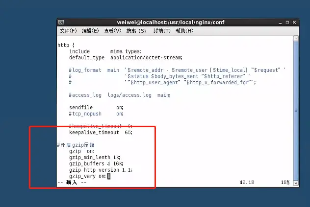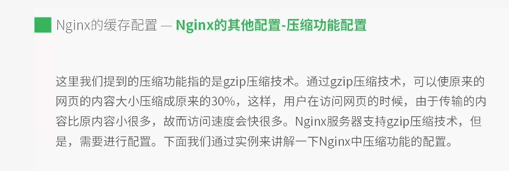 gzip on--开启gzip压缩功能gzip_min_length 1k--对于小于1k的文件不进行gzip压缩处理gzip_buffers 4 16k--压缩成的结果申请内存资源(缓存资源)gzip_http version 1.1--Http版本为1.1才可进行压缩gzip_vary on--服务器与客户端浏览器都需支持gzip压缩技术,客户端不支持,不进行压缩处理