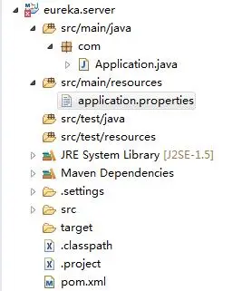 1 #启动端口 2 server.port=1111 3 4 #关闭掉自己往服务中心注册的机制 5 eureka.client.register-with-eureka=false 6 #是否检索服务 7 eureka.client.fetch-registry=false 8 #服务中心地址 9 eureka.client.serviceUrl.defaultZone=http://localhost:${server.port}/eureka/ 项目结构: