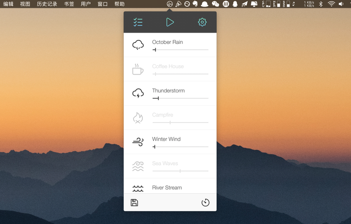 Noizio 还有定时播放的功能,并且可以把你喜欢的声音组合保存以便复用,是非常好的一款小软件。