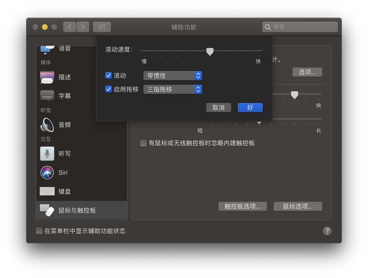 推荐将 光标与点按 > 轻点来点按 的选项勾选,这样就不用每次都用力地按压触控板来点击了。你还可以在这里设置符合自己使用习惯的光标移动速度,一般我是将跟踪速度设置为 “最快”。