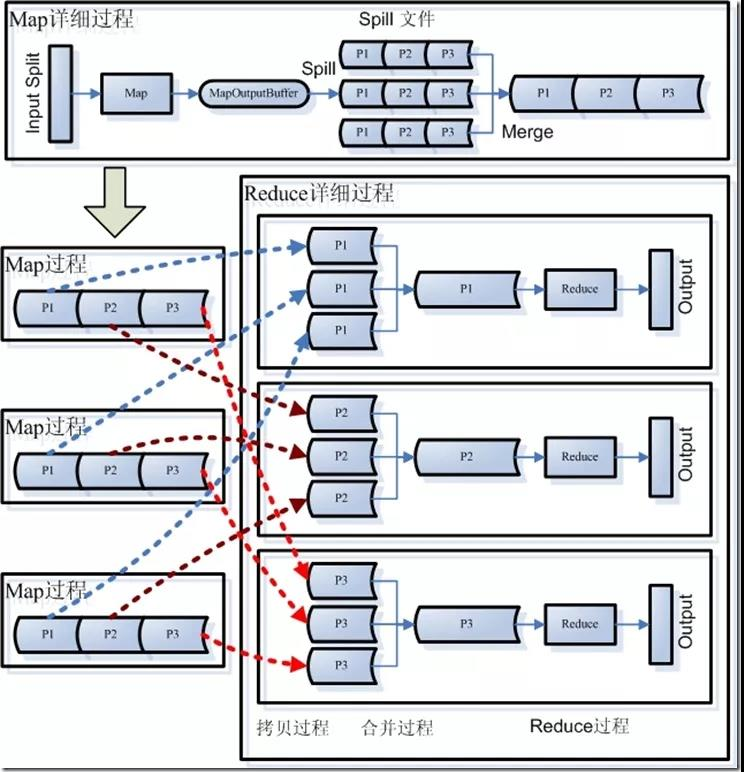 Map-Reduce的过程将一个大任务,split称为多个Map Task,分散到多台机器并行处理,将处理的结果保存到本地,第二个阶段,Reduce Task将中间结果拷贝过来,将结果集中处理,取得最终结果。