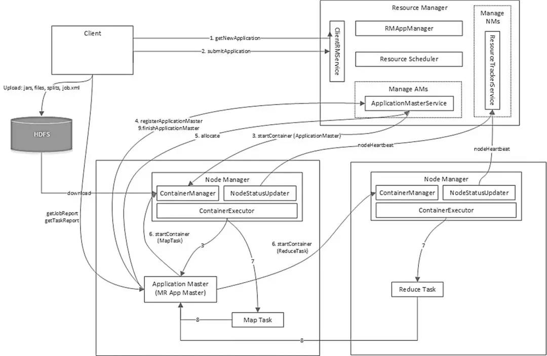 每个任务启动的时候,专门启动一个Application Master,管理任务的调度,他是知道Map和Reduce的。这就是Map-Reduce 2.0如下图。