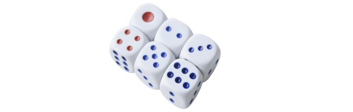 对于抛硬币,正面朝上和反面朝上的概率各为1/2,对于掷骰子,每个点朝上的概率各为1/6。对于这种只有有限种可能的情况,我们通过枚举各种可能的情况,可以算出每个事件发生的概率。例如,如果我们要计算掷骰子出现1点或者2点的概率,只需要将这两点至少有一点出现的情况数,比上所有可能的情况数,就得到概率值:
