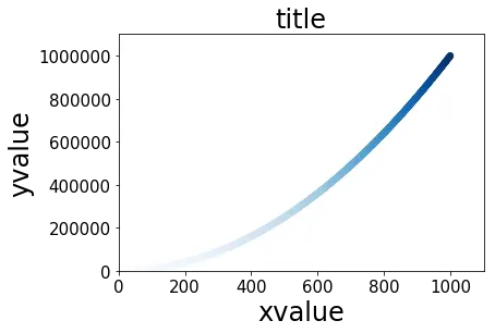 这里将参数c设置成了一个y值列表,并使用参数cmap告诉pyplot使用哪个颜色映射。这些代码将y值较小的点显示为浅蓝色,并将y值较大的点显示为深蓝色