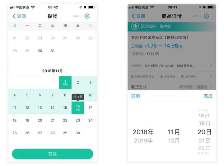 在租期选择环节中,「探物」提供了日历式页面,在明确工作日及周末的同时,选择起租和归还日期后会自动显示租期的总天数。而「内啥」需要通过多次拖动滑轮才可分别完成起租与归还日期的选择,体验较差且繁琐。