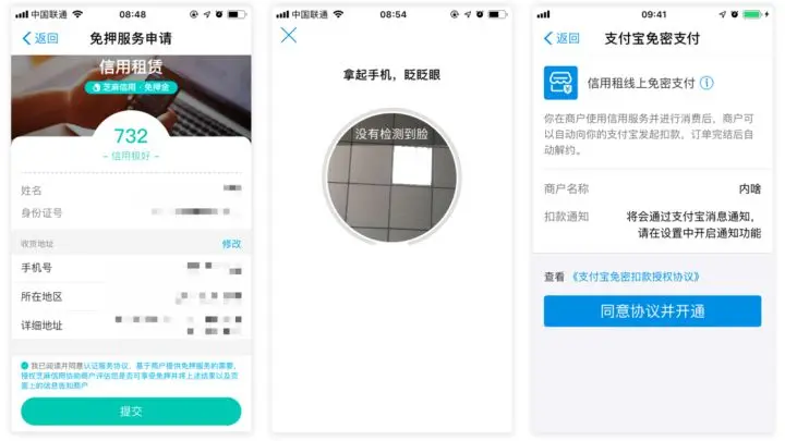 值得注意的是,使用芝麻信用免押服务租赁数码产品时,需要提交免押服务申请、人脸认证以及同意《支付宝免密扣款授权协议》并开通信用租线上免密支付,而这意味着信用消费后,商家可以自动向用户的支付宝账户发起扣款,并称该协议会在订单完结后自动解约。