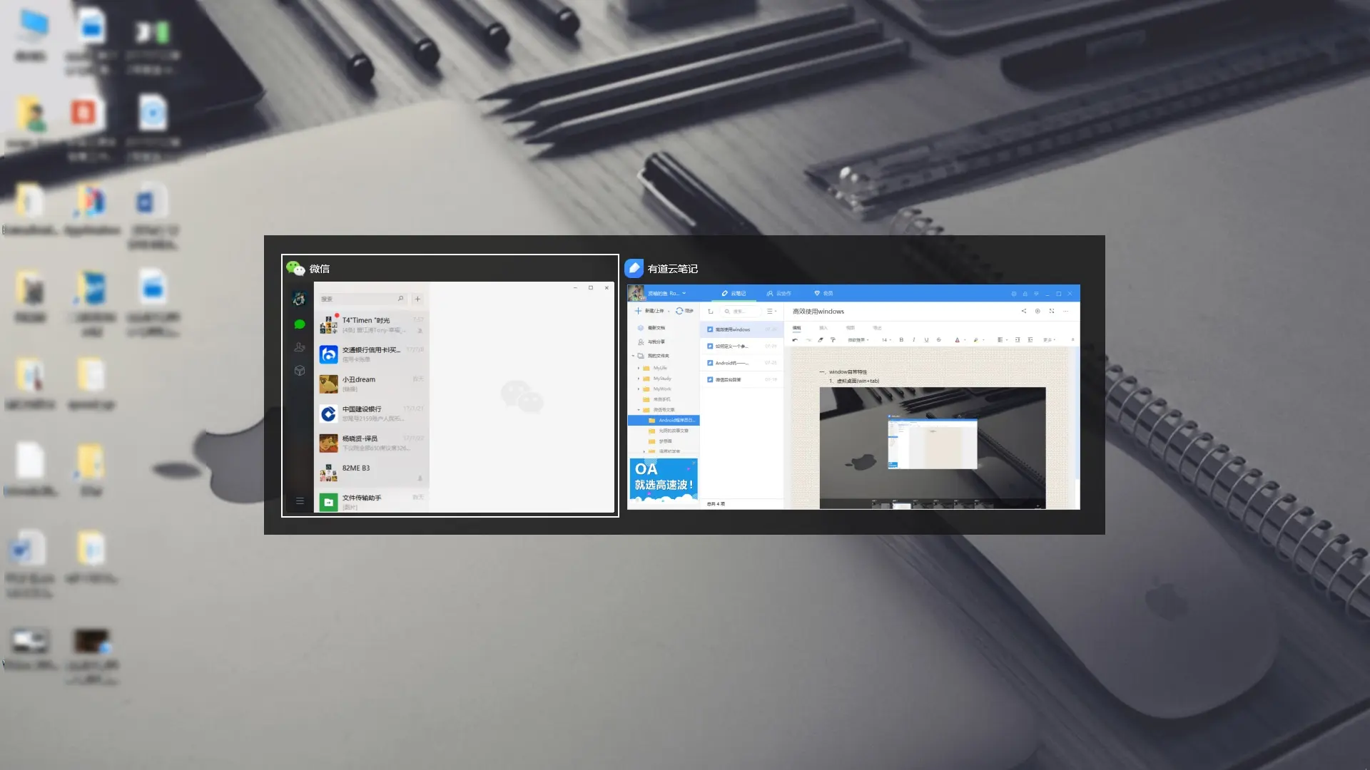 上面第一个特性快捷键可以让我们在记不清有几个桌面或者每个桌面都开了什么软件的情况下进行审视切换。但如果你知道微信在哪个页面,视频比剪辑软件在哪个桌面,Chrome浏览器在哪个桌面,那么我们就可以使用这一组快捷键,这里我们看一下用Ctrl+Win+左/右切换桌面的效果: