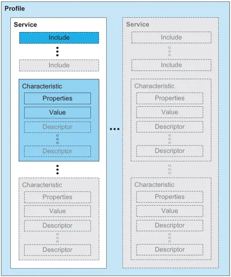 - 外围设备(peripheral):能被中央设备连接的从设备,同一时间外围设备只能被一个中央设备连接。